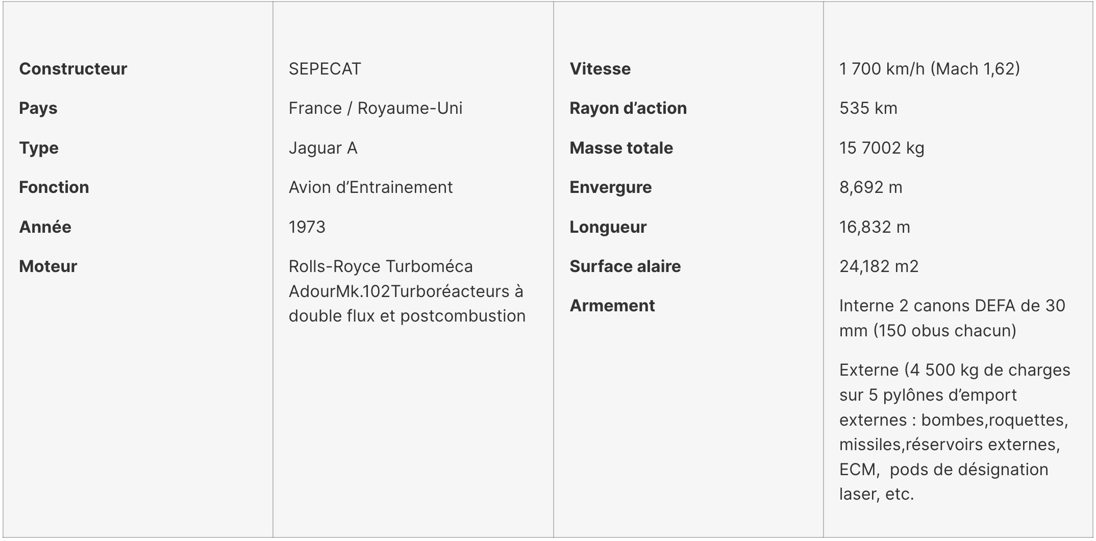 -biplace d’entraînement pour la France (Jaguar E, premier vol le 8 septembre 1968) ; monoplace d’attaque pour la France (Jaguar A, 23 mars 1969)